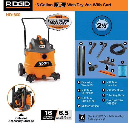 16 Gallon 6.5 Peak HP NXT Shop Vac Wet Dry Vacuum with Cart, Fine Dust Filter, Locking Hose and Accessory Attachments