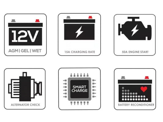 15 Amp Automatic 12V Battery Charger with 50 Amp Engine Start and Alternator Check