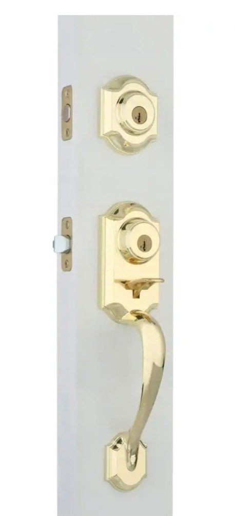 Montara Polished Brass Single Cylinder Door Handleset with Juno Entry Door Knob Featuring SmartKey Security