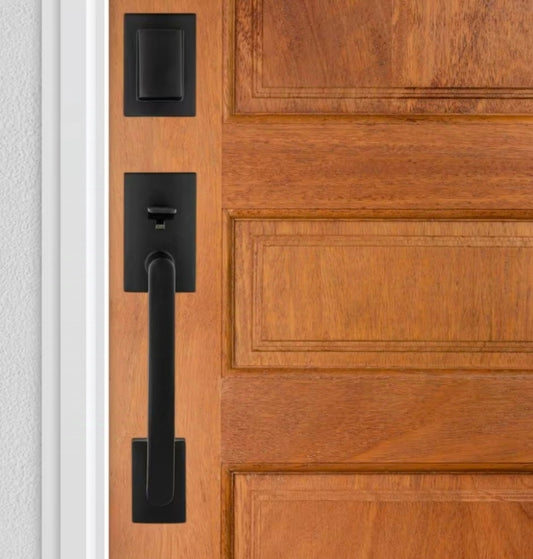 Prestige Spyglass Matte Black Single Cylinder Door Handleset with Square Spyglass Door Handle Feat SmartKey Security