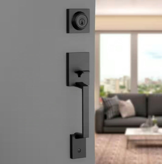 Kwikset Amador Matte Black Entry Door Handleset with Round Rose Hollis Lever Featuring SmartKey Security