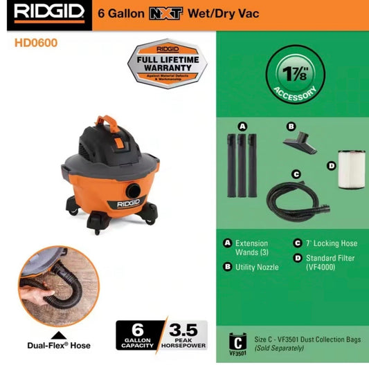6 Gallon 3.5 Peak HP NXT Shop Vac Wet Dry Vacuum with General Debris Filter, Dust Bags, Locking Hose and Accessories