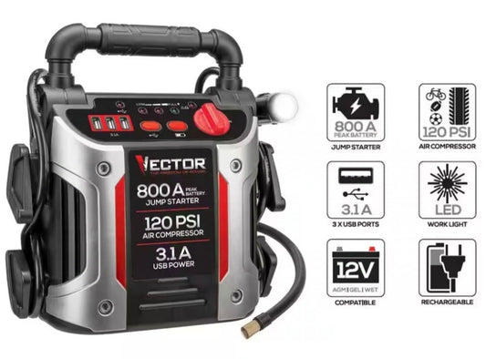 800 Peak Amp Automotive Jump Starter, Portable Power - Triple 15W USB Ports, 120 PSI Air Compressor