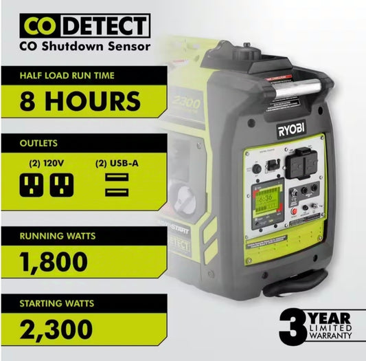 RYOBI 2,300-Watt Recoil Start Bluetooth Super Quiet Gasoline Powered Digital Inverter Generator with CO Shutdown Sensor