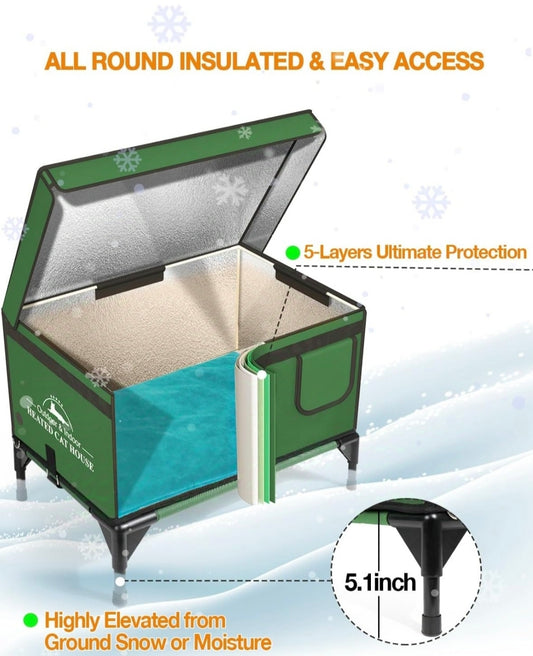 Clawsable Indestructible Heated Cat House for Outdoor Cats in Winter, Extremely Waterproof, Fully Insulated Outside Feral Cat House Shelter for Stray Barn Cat (Bush Green, M-13"x21"x17")
