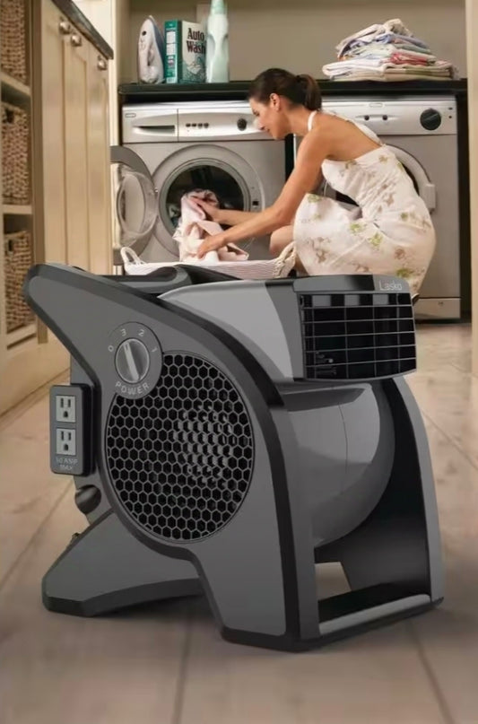 Lasko 11.2 in. 3 Speeds Blower Fan in Gray with Carry Handle, Circuit Breaker, Power Outlets, High Velocity Utility Pivoting