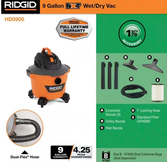 9 Gallon 4.25 Peak HP NXT Shop Vac Wet Dry Vacuum with General Debris Filter, Locking Hose and Accessory Attachments RIDGID