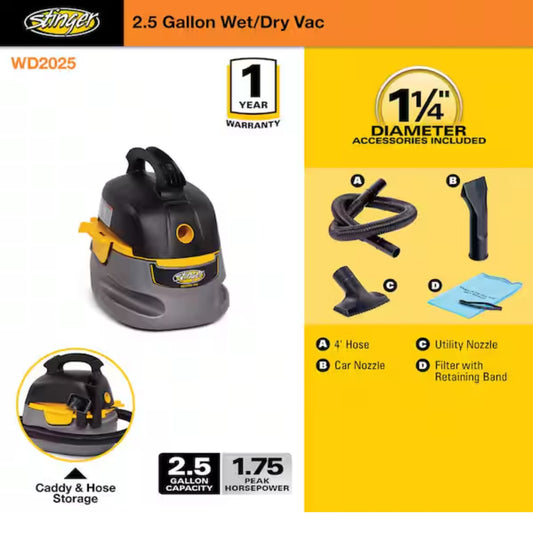 Stinger 2.5 Gallon 1.75 Peak HP Small Shop Vac Wet Dry Vacuum with Filter Bag, Hose, Utility Nozzle and Car Nozzle Attachments