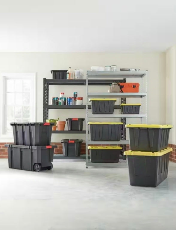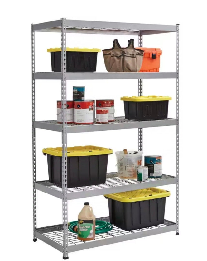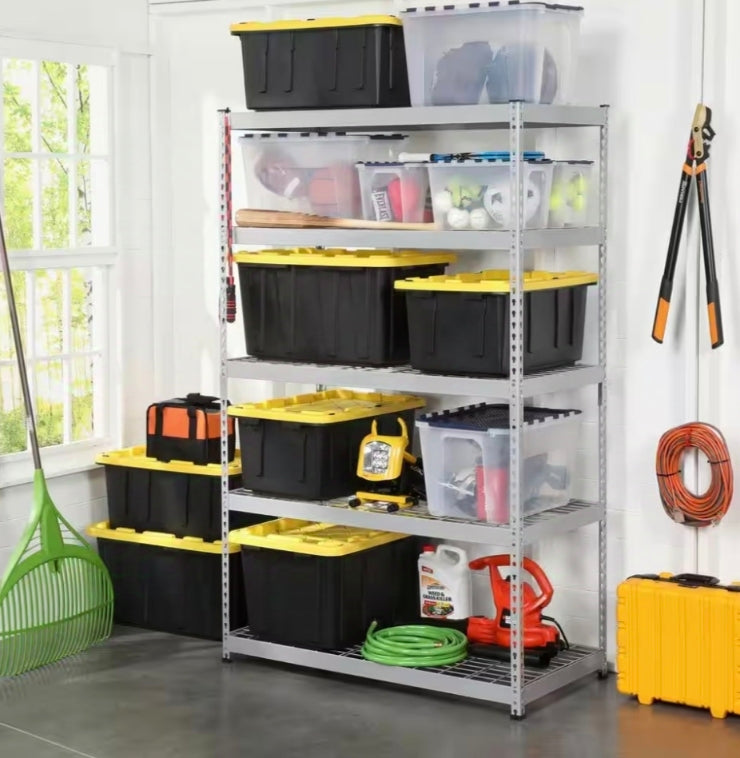 5 shelves that provide ample storage for bins, boxes, tools, food containers and more