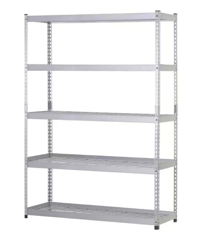 Steel beams and shelves with wire decking and a durable silver enamel finish